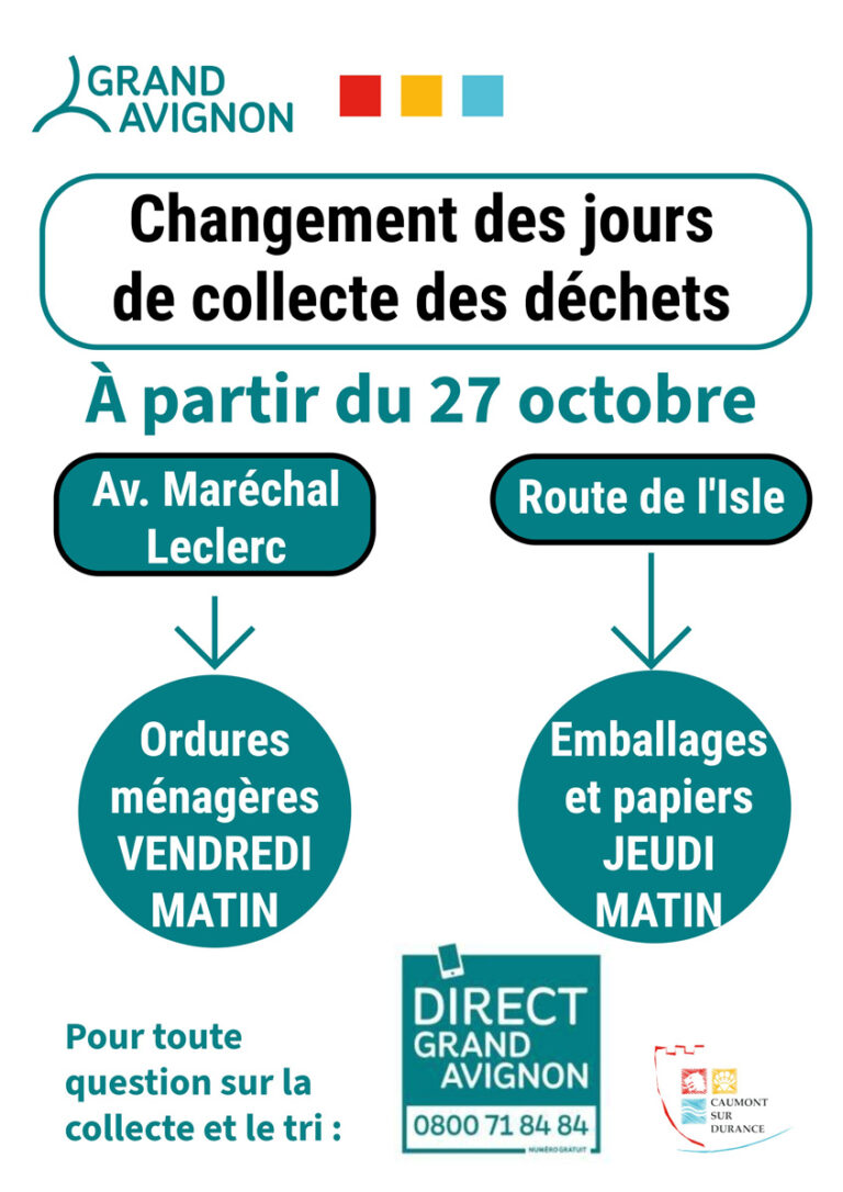Le Grand Avignon va effectuer un changement des jours de collecte des déchets et tri sur la route de l'Isle et l'avenue Maréchal Leclerc à partir du 27 octobre.
