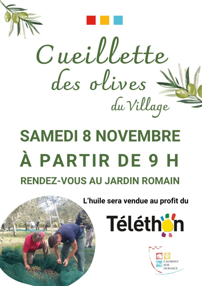 Le Conseil Municipal organise une matinée de récolte citoyenne des olives des arbres de la commune afin de vendre par la suite l’huile d’olive fabriquée au profit du Téléthon. Cette matinée se déroulera le samedi 8 novembre, le rendez-vous est donné à 9h au Jardin Romain.