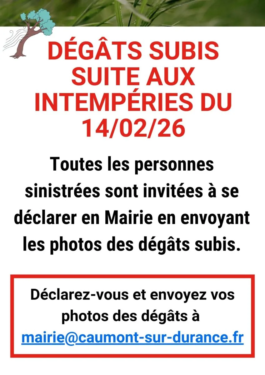 Merci de vous signaler en Mairie (nom, prénom, adresse…) et d’envoyer vos photos des dégâts subis à l’adresse mail suivante : mairie@caumont-sur-durance.fr