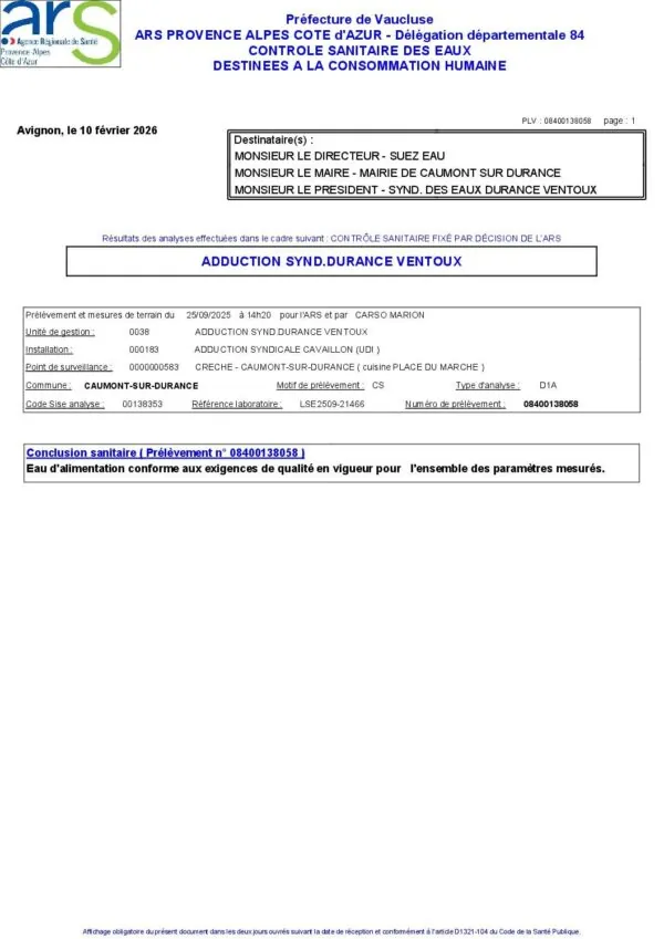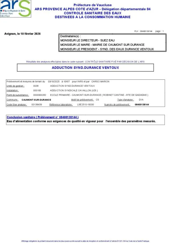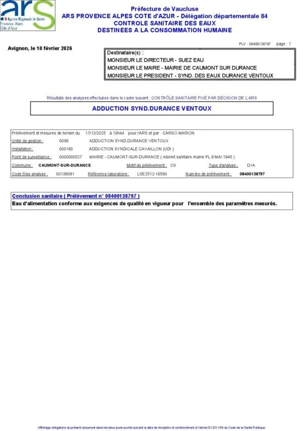 Le Syndicat des eaux Durance - Ventoux effectue régulièrement des contrôles de la qualité de l'eau.